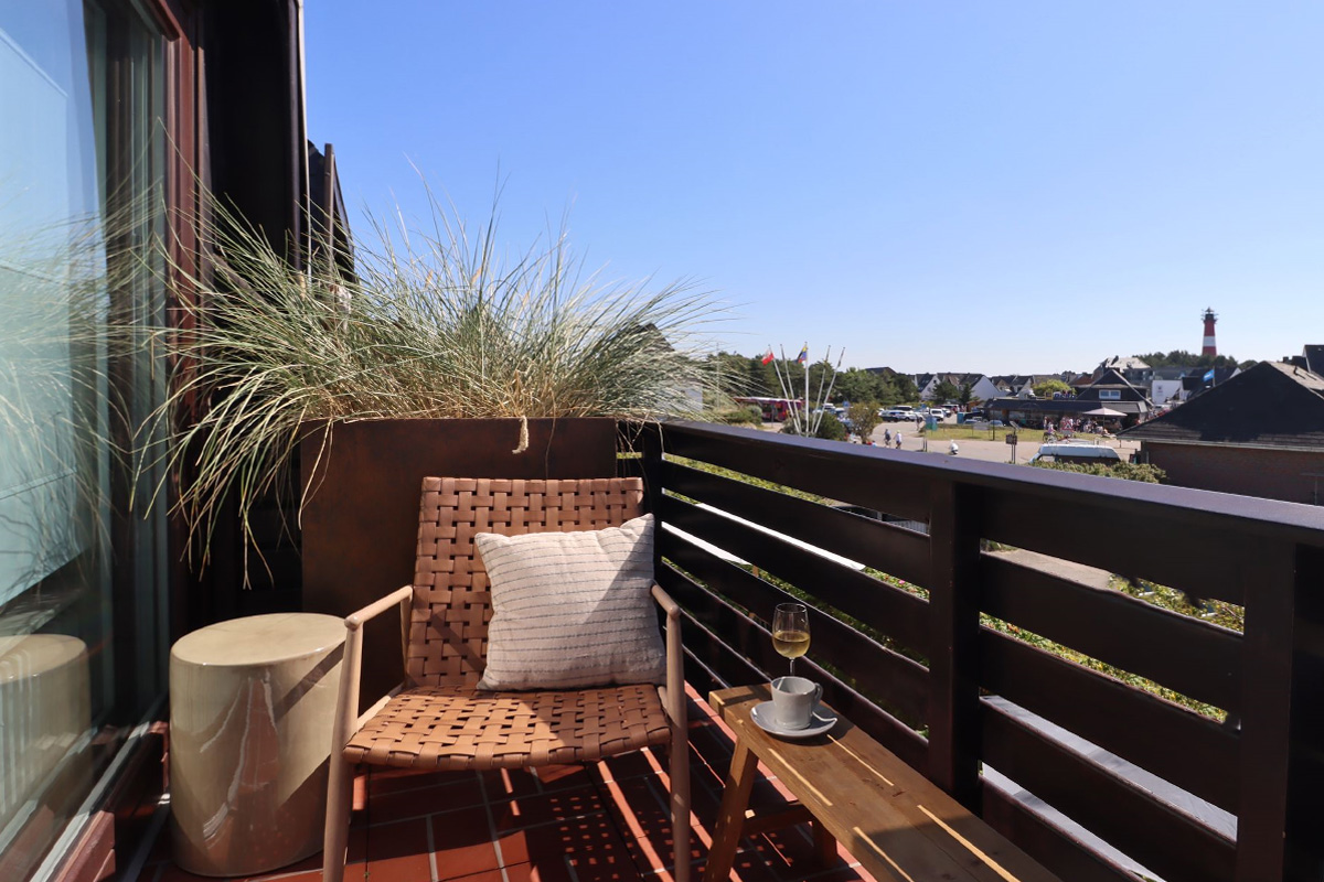 Der Süd-Ost-Balkon bietet ausreichend Platz für ein Sonnenbad oder einen Sundowner in den Outdoor Sesseln.